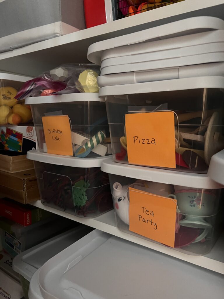 The one thing that drives me absolutely insane is cardboard boxes. For toys, for games, anything. They start to wear down and get torn open sideways, never to be securely closed again, with loose pieces falling out the second someone takes it off the shelf the wrong way. And you just hear it. You hear the crash and burn coming. I KNOW YOU KNOW WHAT I’M TALKING ABOUT. So I will replace all beat up boxes with these cheap storage boxes from Target. I also use them to store arts and crafts supplies, all those small Barbie pieces, Lego sets, you name it, they’re good for it. I use a Post-It Note backwards to label the boxes that need it (aka, so Phil knows where to put things away).
